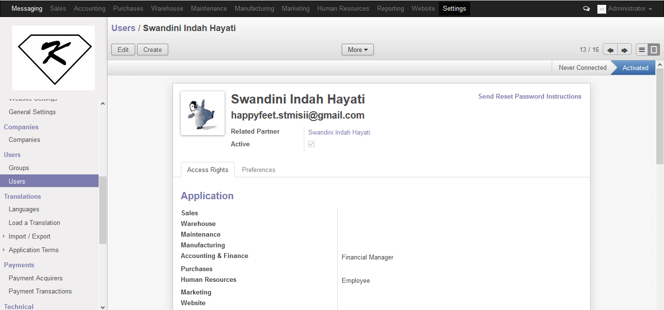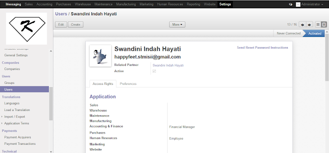 - maka tampilan akan berubah pada menu users dengan adanya tambahan Swandini Indah Hayati sebagai ( Accounting & Finance )