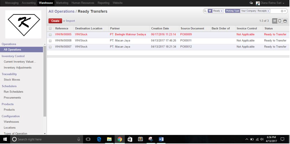 PT.KITA merupakan perusahaan yang bergerak dibidang perdagangan. Antara lain: jasa pengadaan komputer, laptop, dan PC. Di dalam PT.KITA terdapat divisi Warehouse yang bertugas memonitor perolehan order serta merangkum forecast untuk memastikan kapasitas produksi terisi secara optimal dan memonitor jumlah stok seluruh Dept. Sales & Marketing untuk memastikan umut stok perusahaan tidak melebihi target yang telah ditentukan. Divisi ini mengerjakan tugasnya dengan menggunakan Odoo. Disini saya akan menjelaskan bagaimana cara divisi Warehouse PT.KITA menjalankan tugasnya.